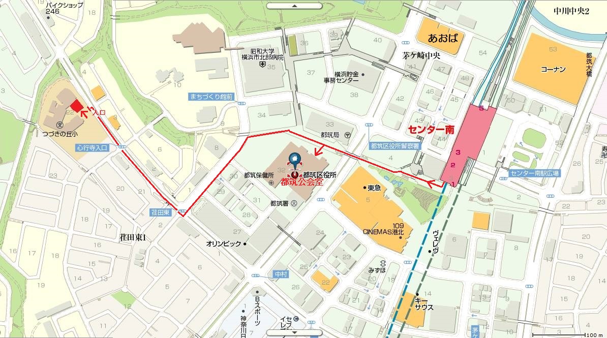 つづきの丘小学校コミュニティハウス、都筑公会堂への道順